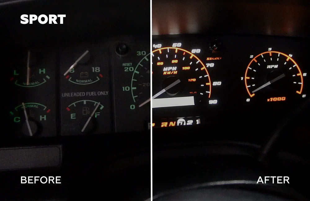 - Modernized Illumination & Style: Revamp your interior with upgraded cluster gauges, matching gear indicators, and HVAC controls.